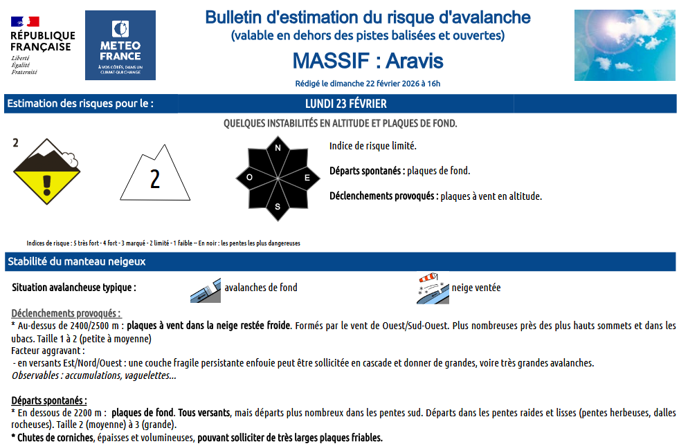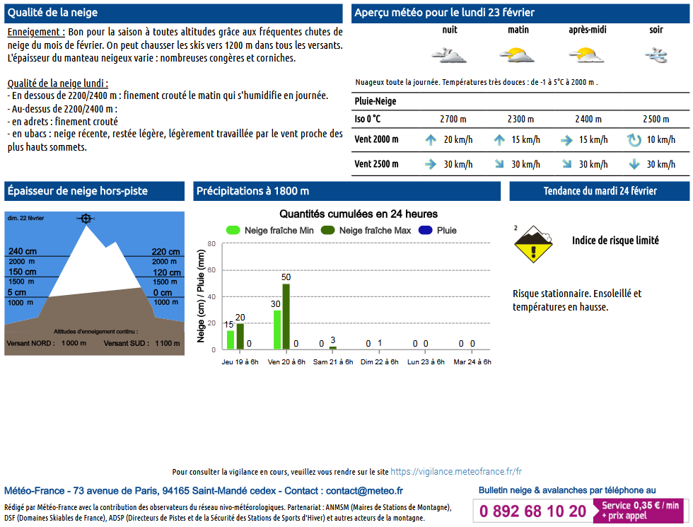 Ce bulletin est édité par MeteoFrance en lien avec les stations, prévisionnistes nivologues et pisteurs situés sur place (uniquement disponible à l’automne dès les premières neiges et jusqu’au printemps). Un bulletin « information neige et avalanche » est également proposé lorsque les informations sont réduites.