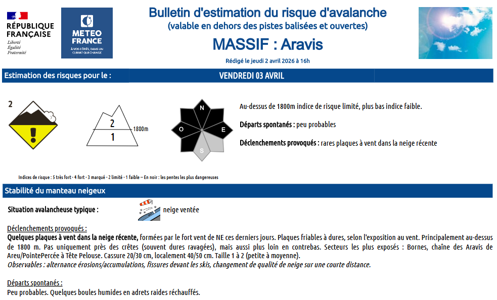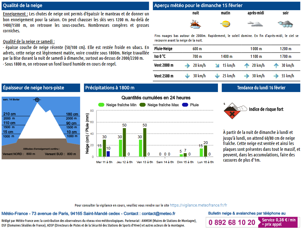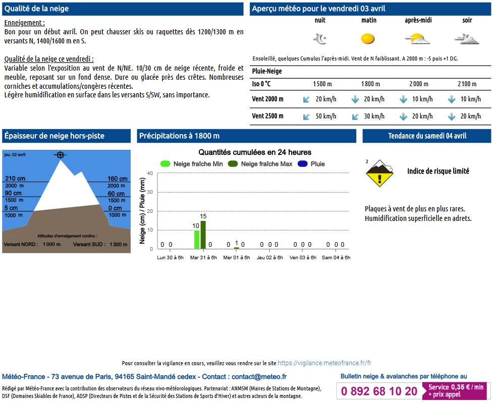 Ce bulletin est édité par MeteoFrance en lien avec les stations, prévisionnistes nivologues et pisteurs situés sur place (uniquement disponible à l’automne dès les premières neiges et jusqu’au printemps). Un bulletin « information neige et avalanche » est également proposé lorsque les informations sont réduites.